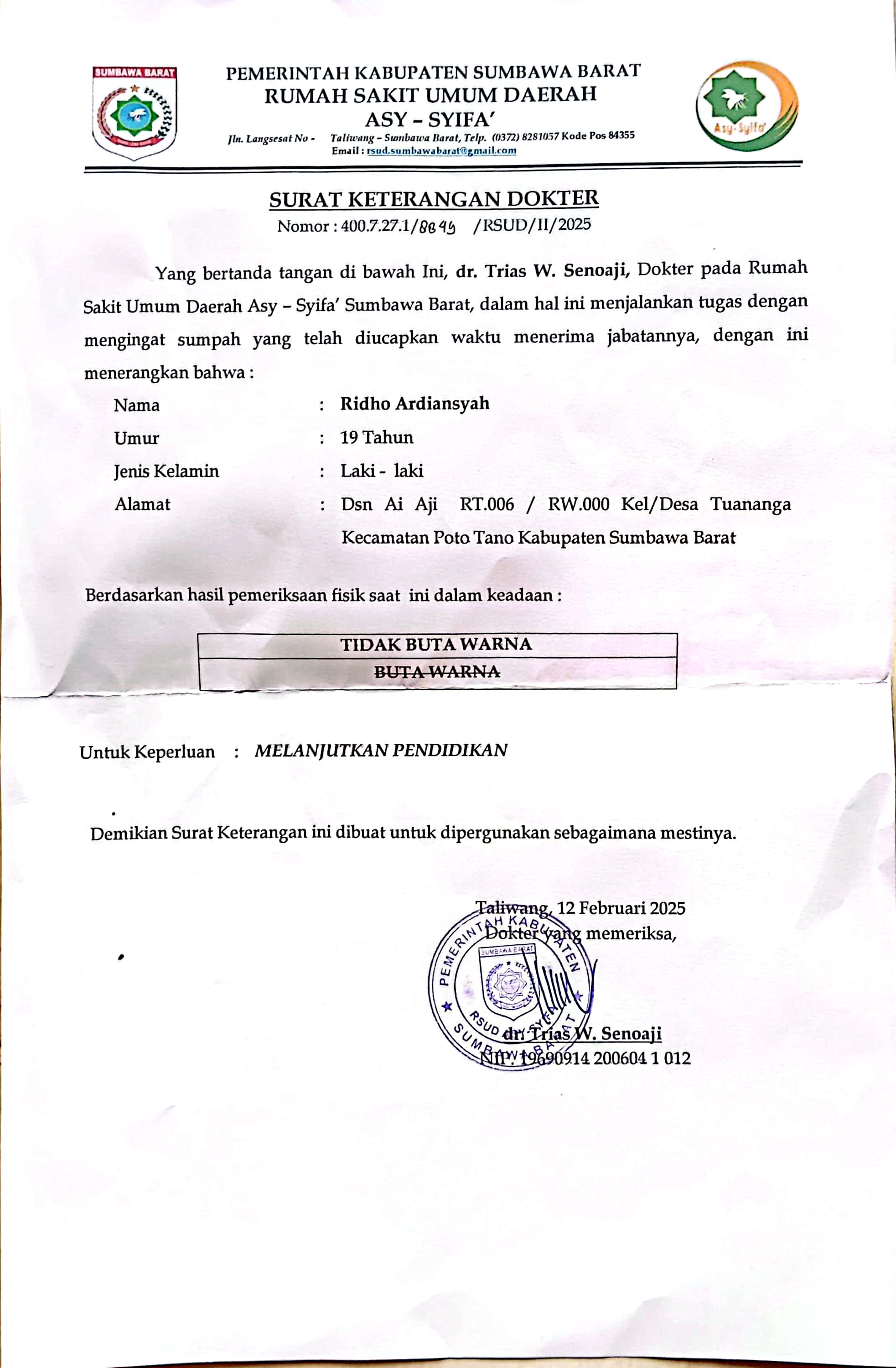 ![]() | Surat keterangan tidak buta warnaRIDHO ARDIANSYAH1060610603eNver0jtbU.jpg | 2025-03-08 06:44 | 241K | |