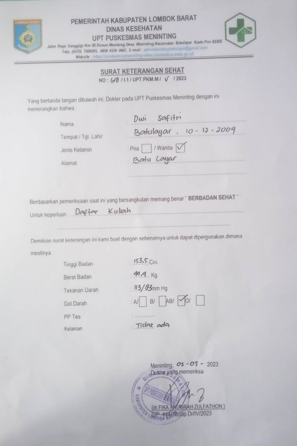 ![]() | Surat keterangan sehat jasmani dan rohaniDwi safitri337337Rr7hzY8CRA.jpg | 2023-05-05 08:50 | 490K | |