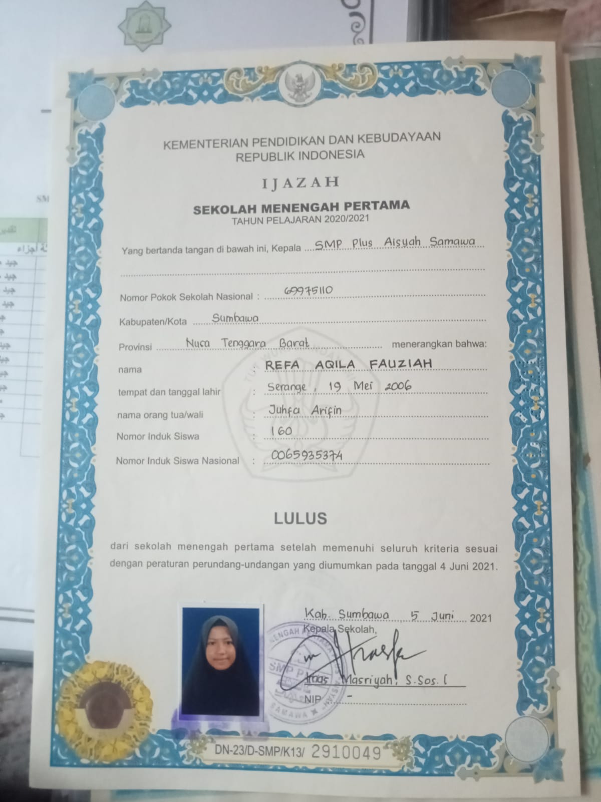 Index of /storage/app/public/mahasiswa/Gelombang I6/Umum37/Refa AQila Fauziah520426590506000255255525/Ijazah SMP/SMA