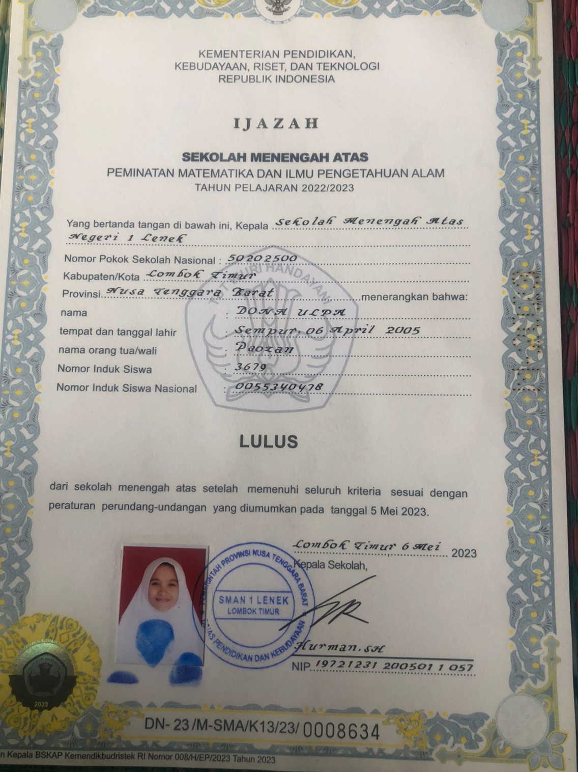 Index of /storage/app/public/mahasiswa/Gelombang II3/Prestasi Akademik12/Dona ulpa520309410405000418121812/Ijazah SMP/SMA