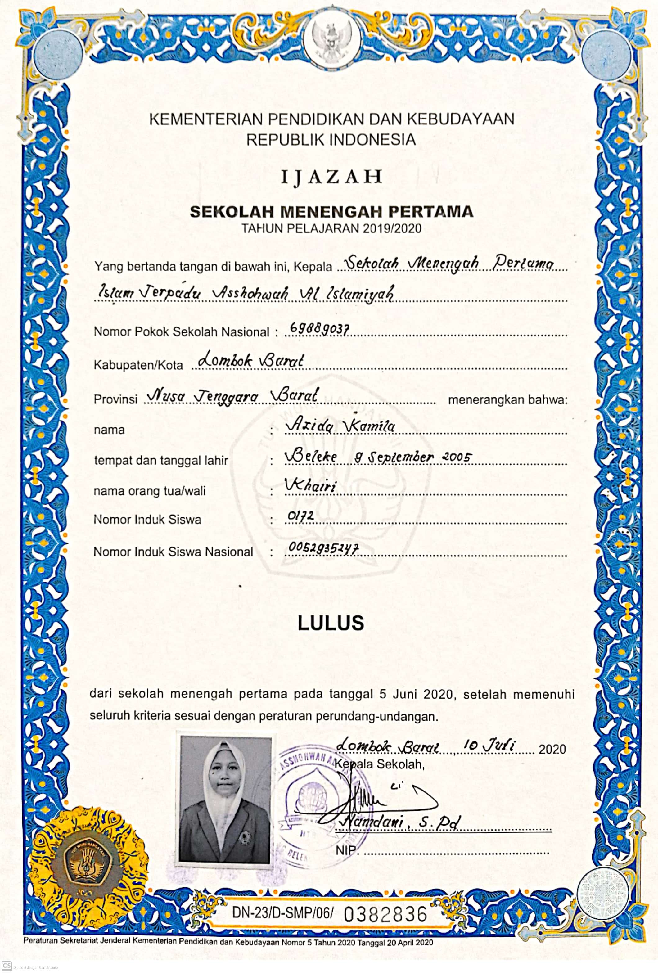 Index of /storage/app/public/mahasiswa/Gelombang III4/Bidikmisi27/AZIDA KAMILA520101490905000742174217/Ijazah SMP/SMA