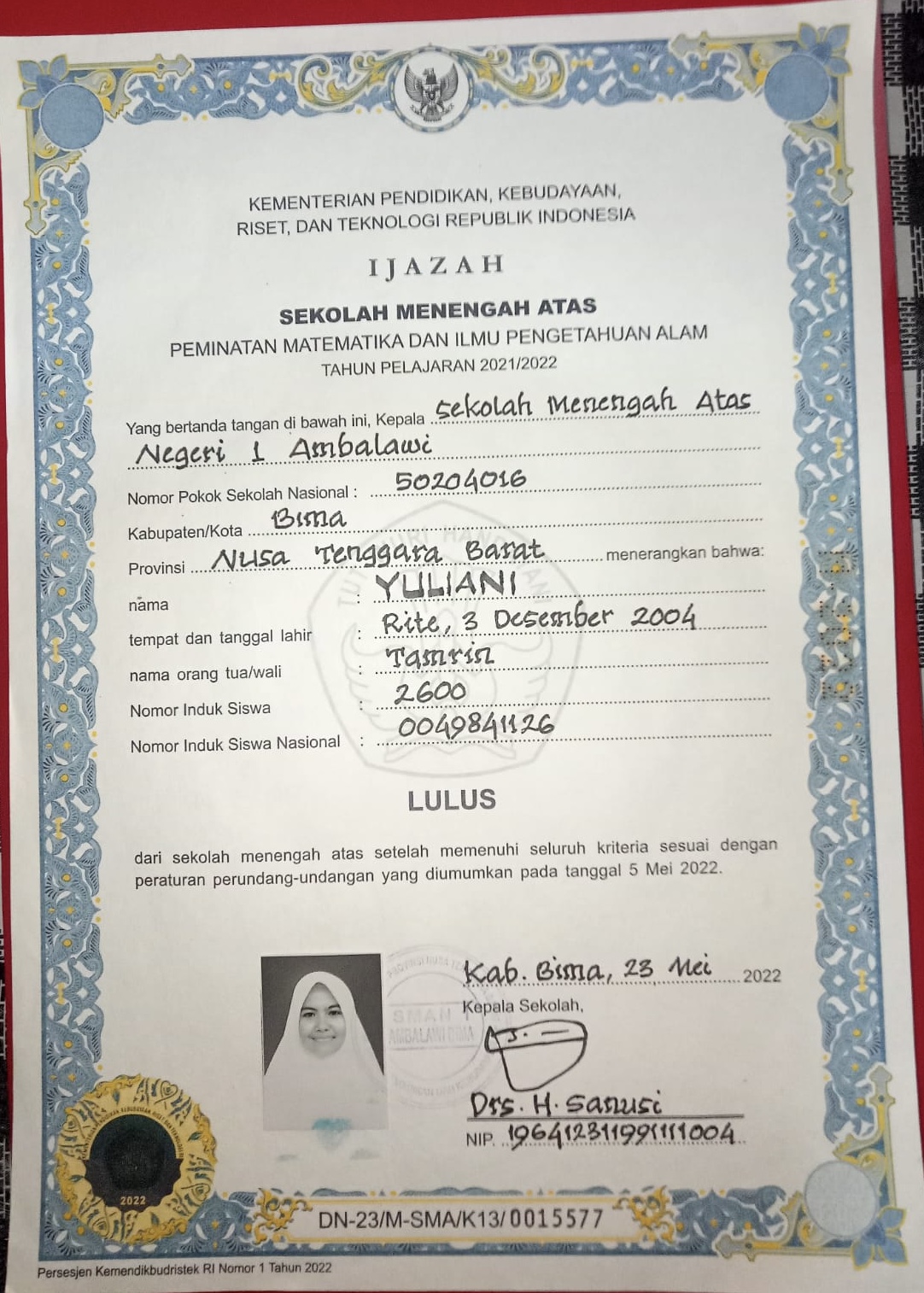 Index of /storage/app/public/mahasiswa/Gelombang III4/Bidikmisi27/Yuliani520610431204000250715071/Ijazah SMP/SMA