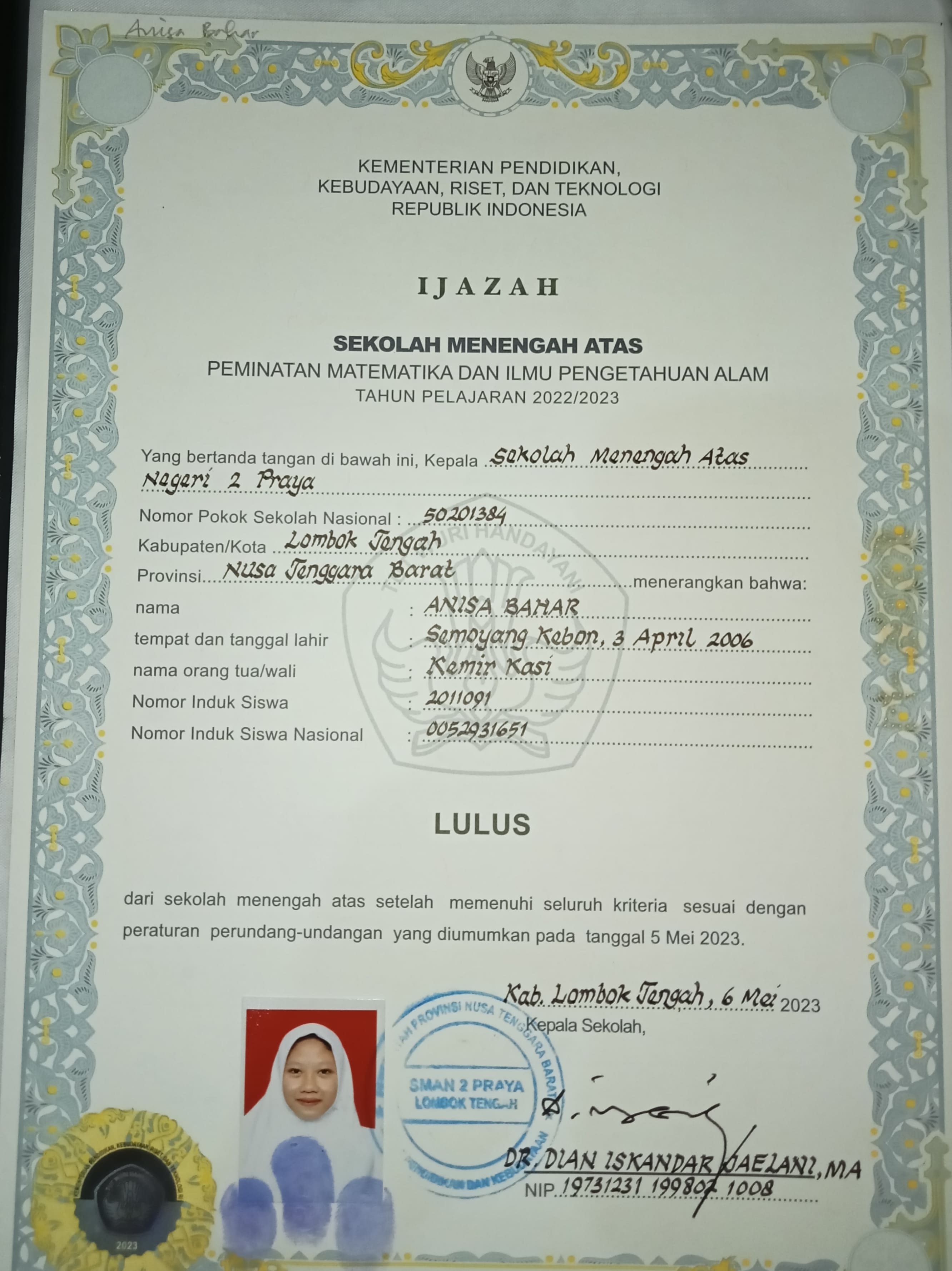 Index of /storage/app/public/mahasiswa/Gelombang III4/Umum20/Anisa Bahar520206410706024527542754/Ijazah SMP/SMA