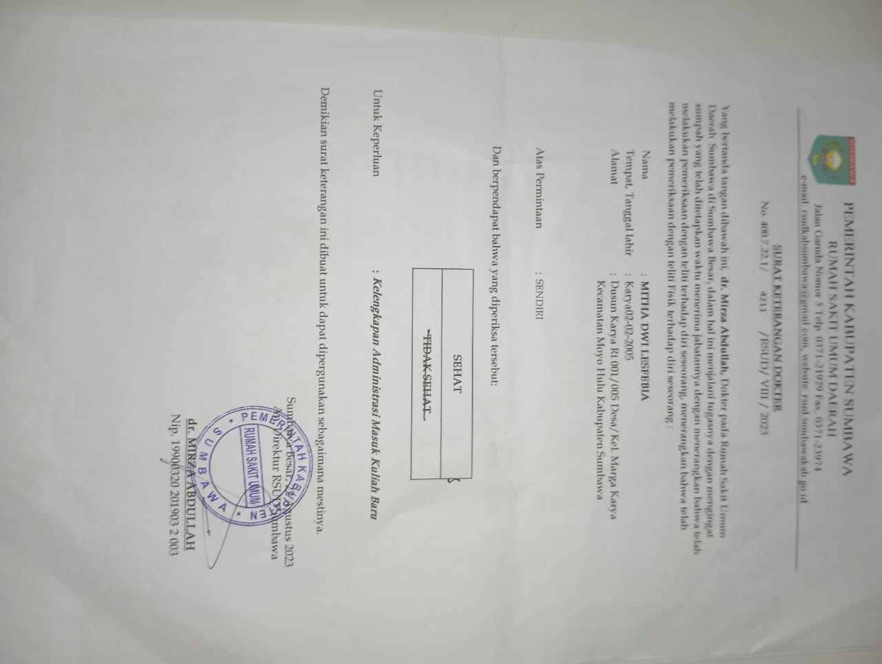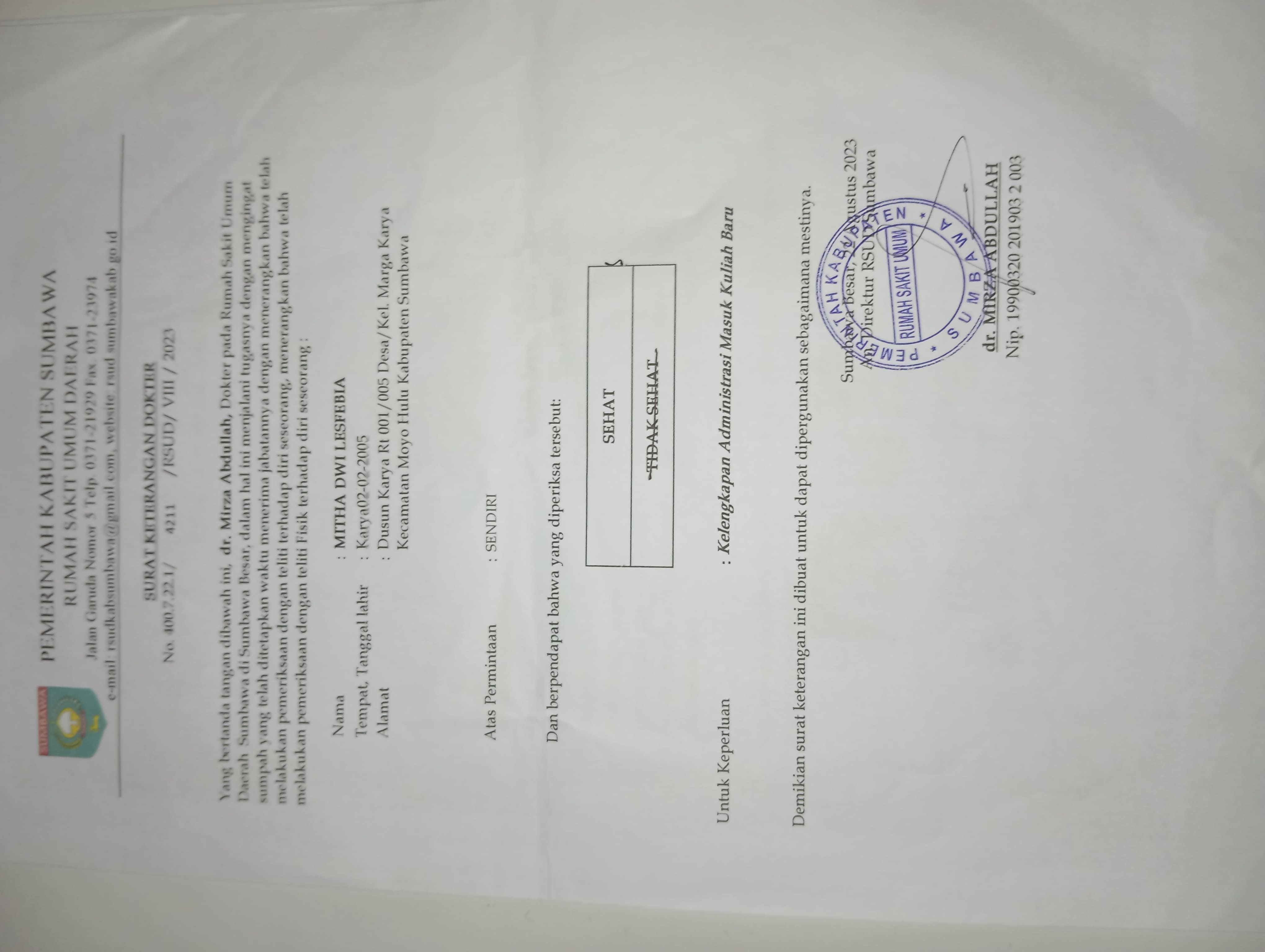 ![]() | Surat keterangan sehat jasmani dan rohaniMitha Dwi Lesfebia23272327Z9LsS4VSkm.jpg | 2023-08-27 12:06 | 64K | |