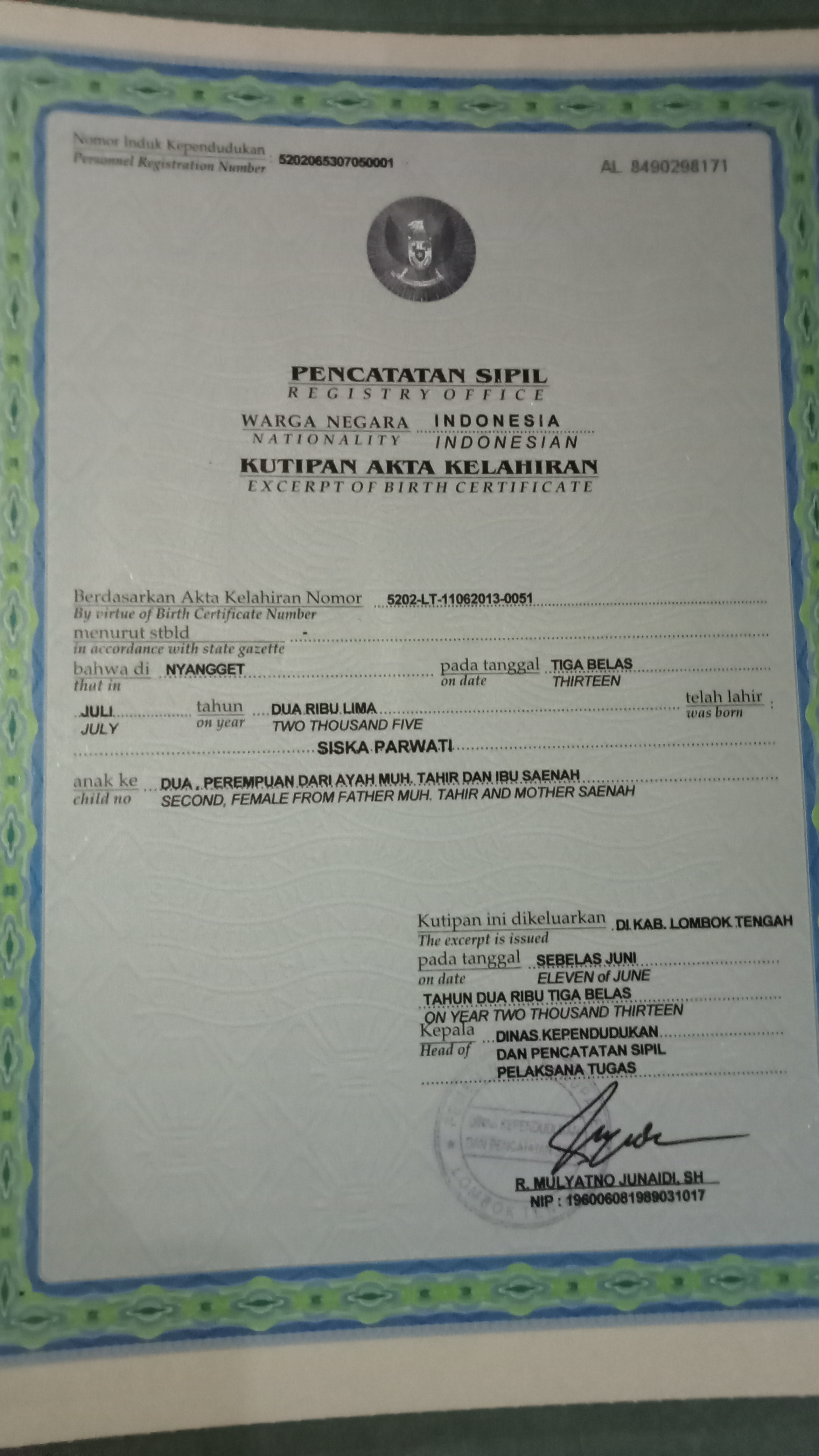 ![]() | Akta KelahiranSiska Parwati51815181NgnABvthV3.jpg | 2023-09-12 02:54 | 1.9M | |