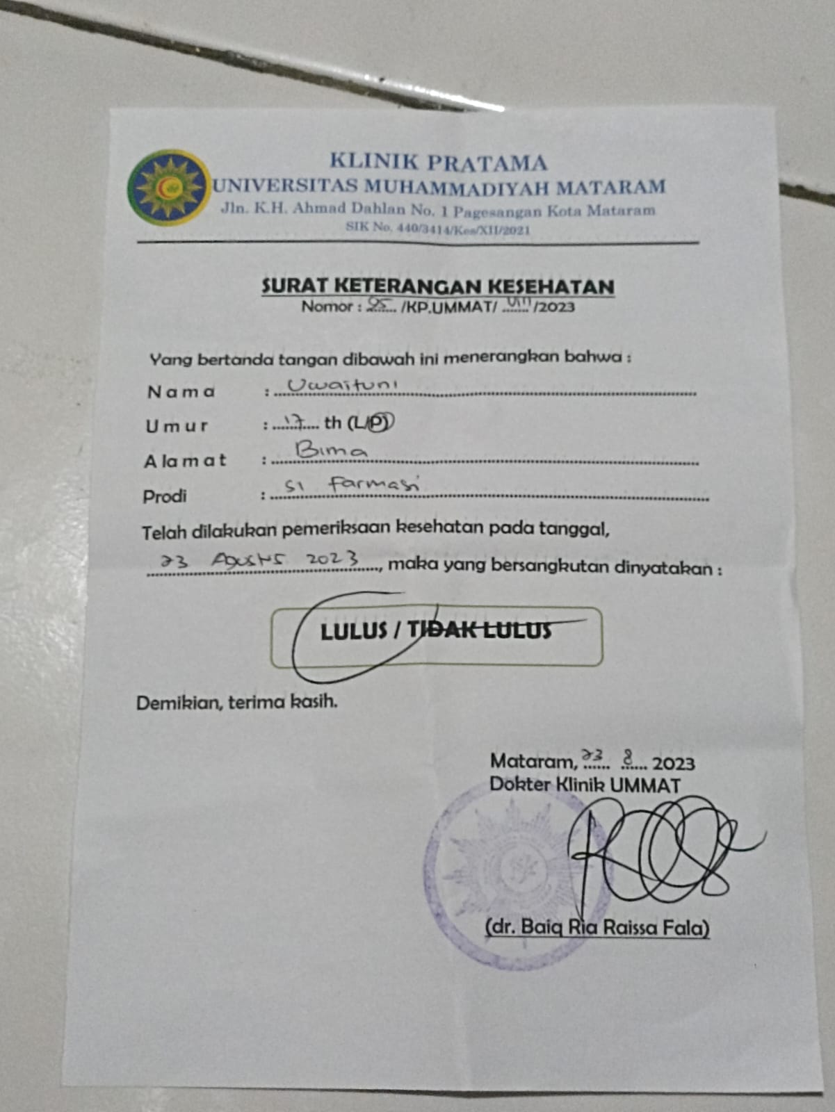 ![]() | Surat keterangan sehat jasmani dan rohaniUwaituni27702770PdC0i0Xnfm.jpg | 2023-10-12 01:31 | 125K | |