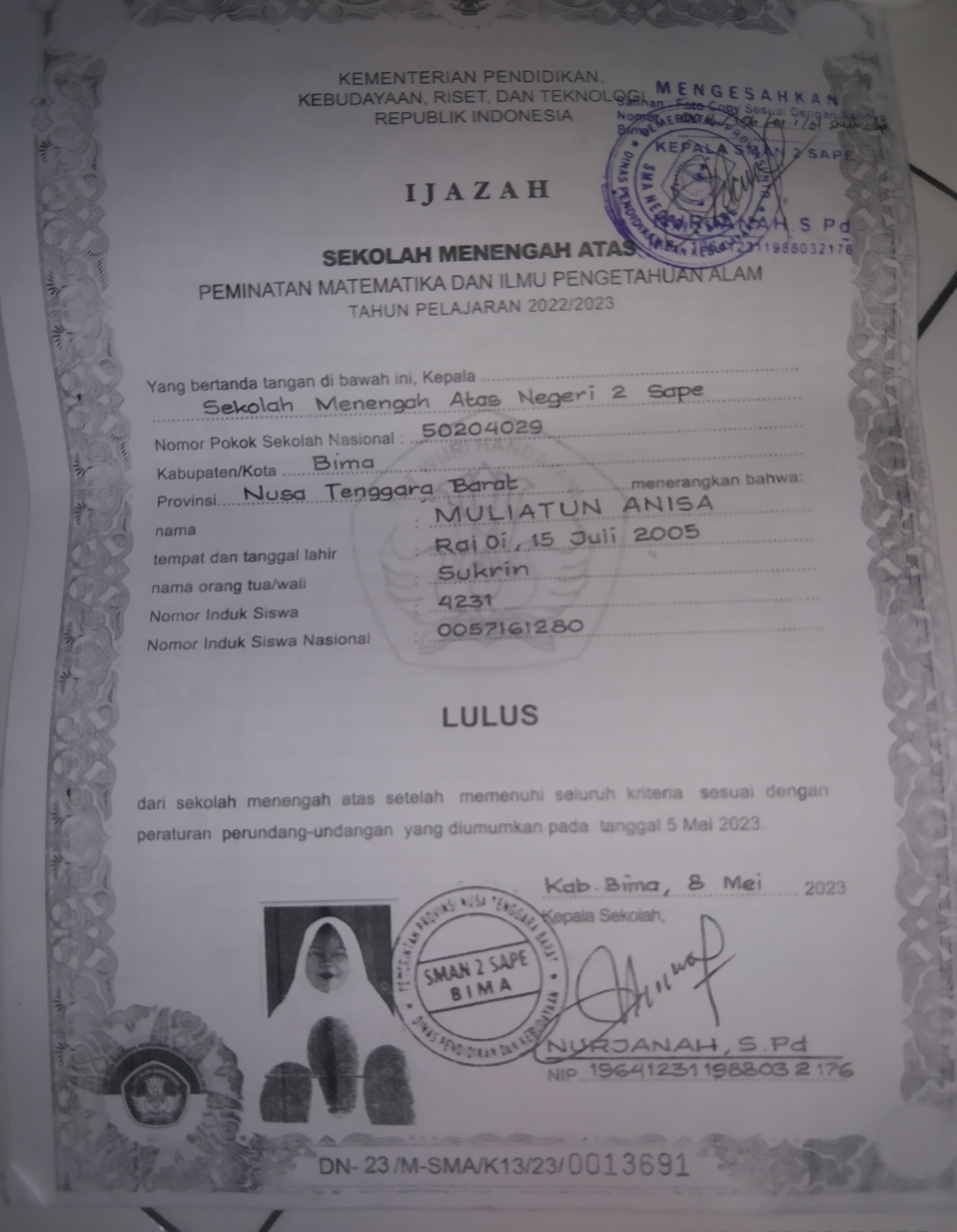 Index of /storage/app/public/mahasiswa/Gelombang III8/Bidikmisi54/Muliatun anisa520606550705100286608658/Ijazah SMP/SMA
