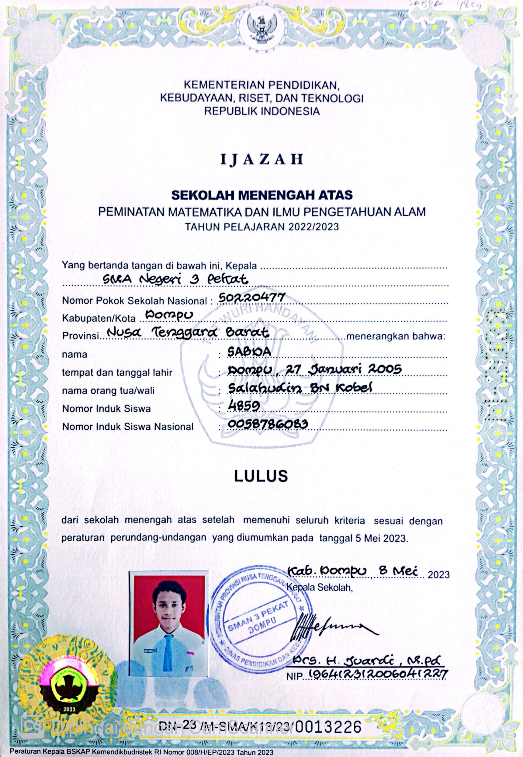 Index of /storage/app/public/mahasiswa/Gelombang III8/Bidikmisi54/SABDA520506270105000292869283/Ijazah SMP/SMA