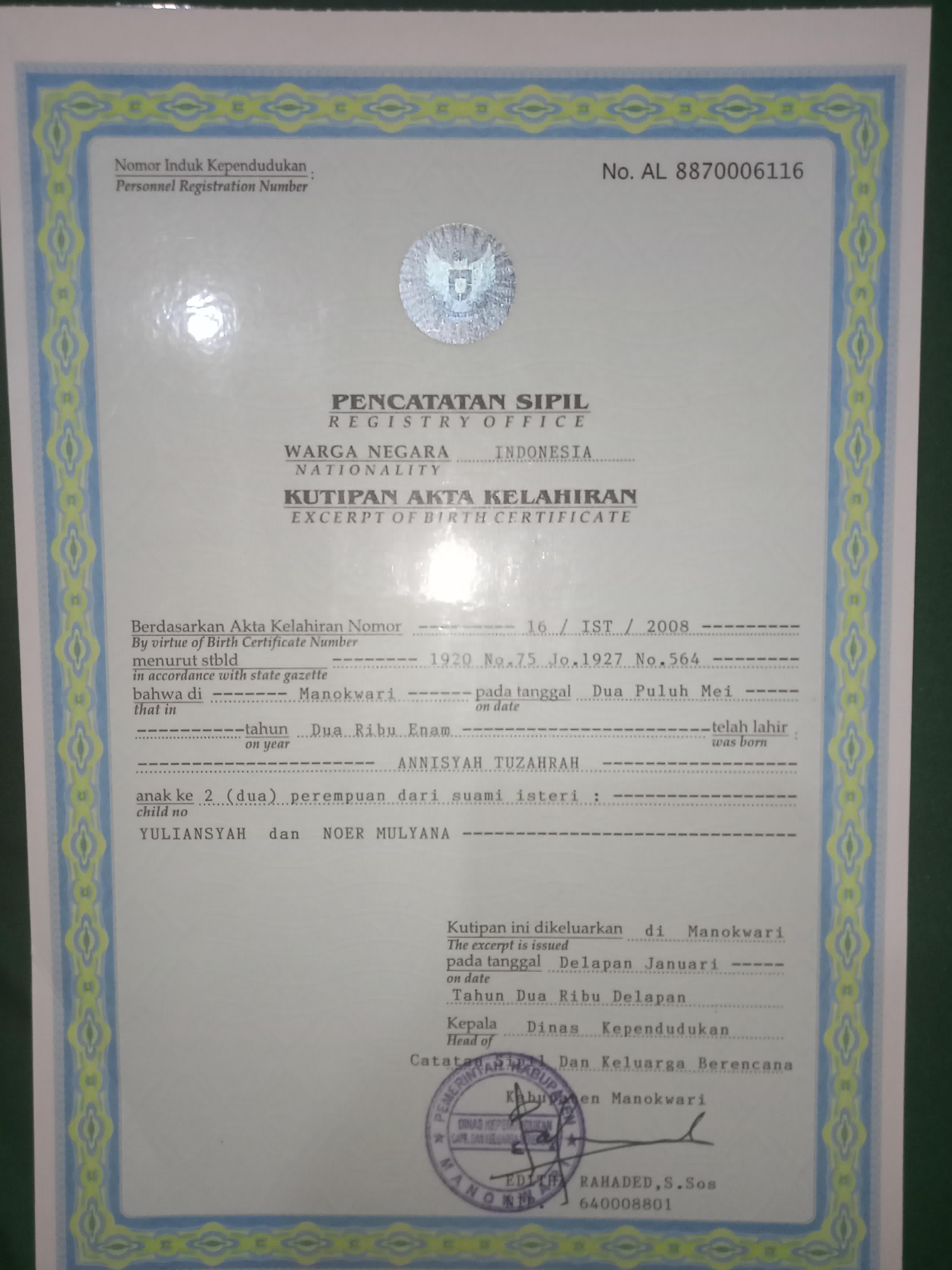 ![]() | Akta KelahiranAnnisyah Tuzahrah93189315vS2HzXH22w.JPG | 2024-08-26 12:47 | 325K | |