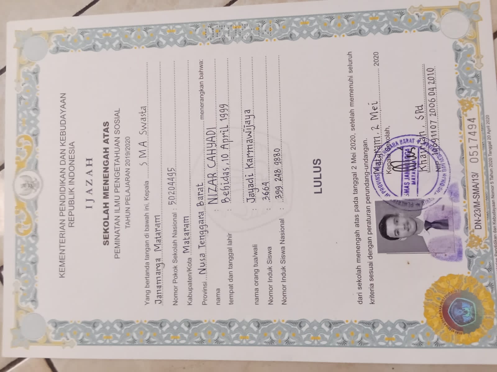 Index of /storage/app/public/mahasiswa/Gelombang III8/Umum53/NIZAR CAHYADI527102100499001078527851/Ijazah SMP/SMA