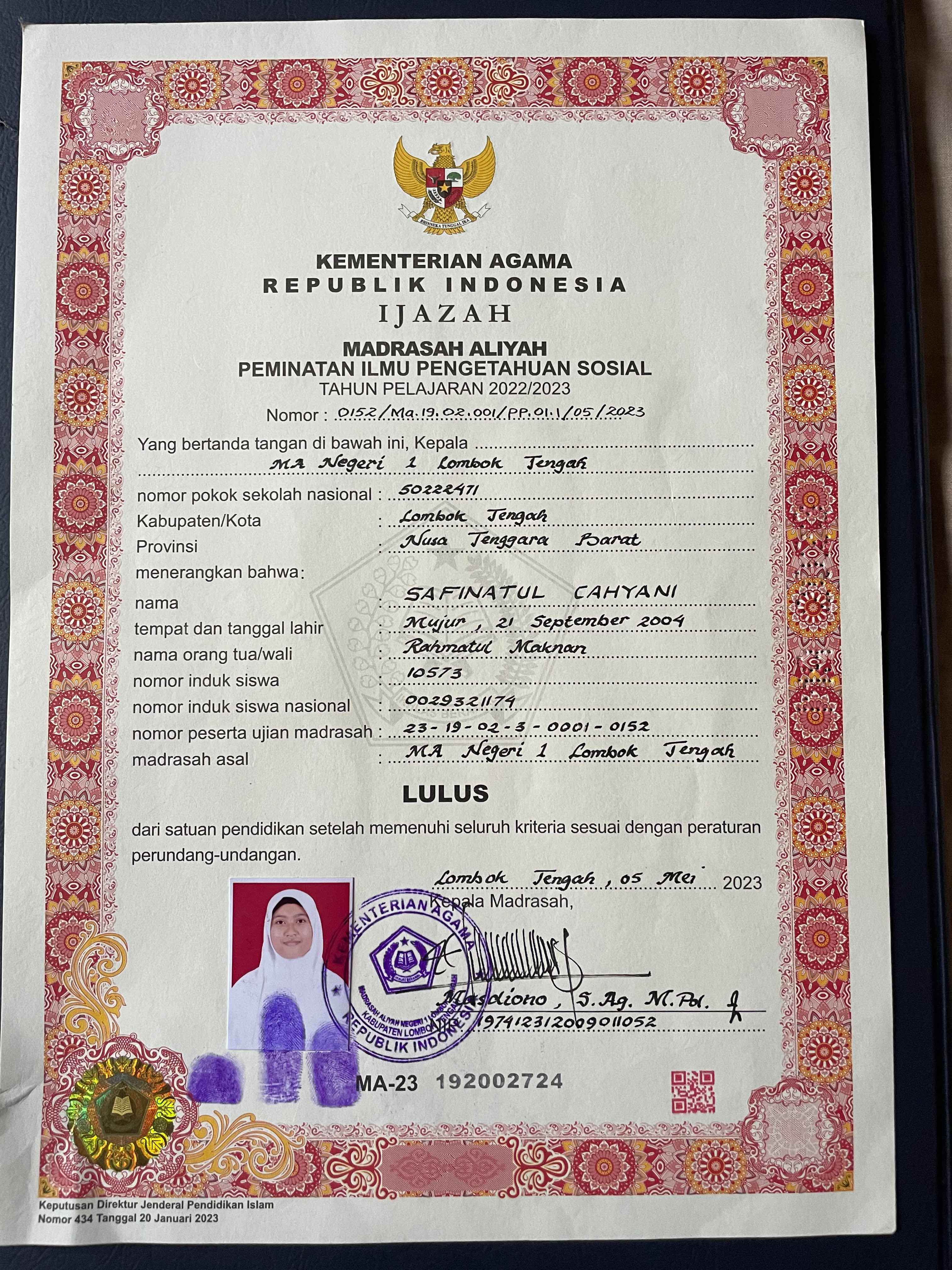 Index of /storage/app/public/mahasiswa/Gelombang III8/Umum53/SAFINATUL CAHYANI520206610904000295589555/Ijazah SMP/SMA